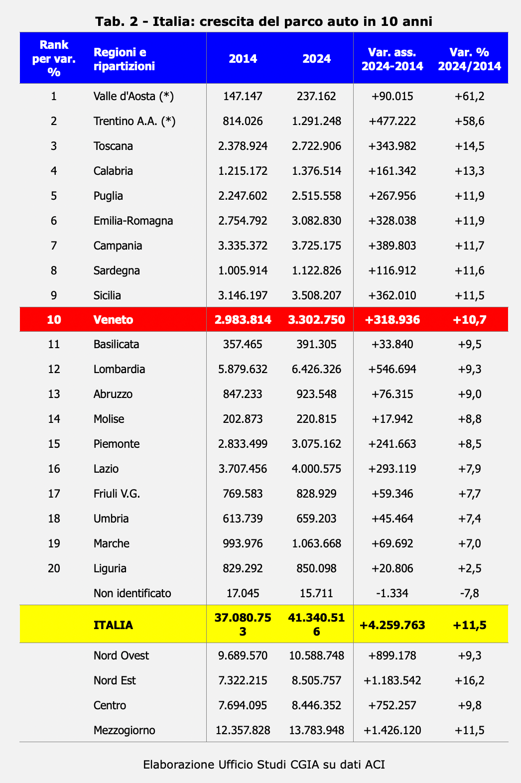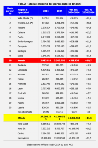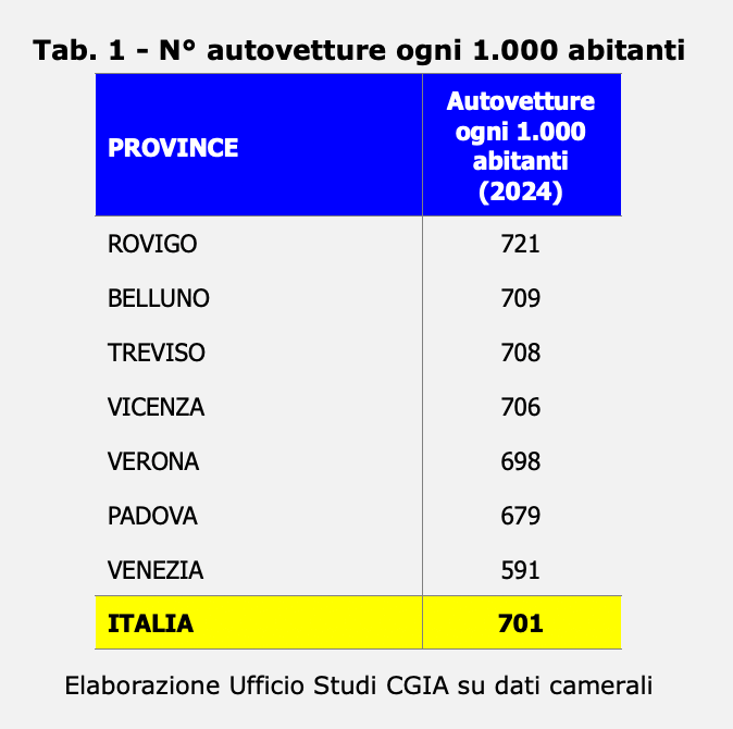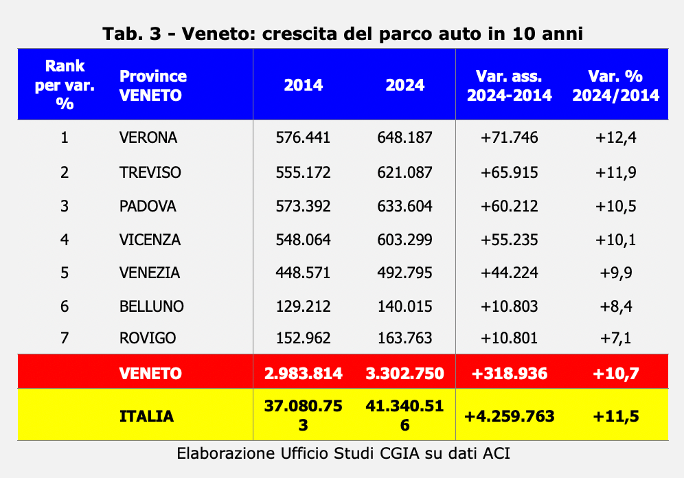 Può sembrare un controsenso, ma i numeri raccontano una storia solo in apparenza paradossale. L’Italia è il Paese europeo con la maggiore densità di automobili: circolano 701 vetture ogni mille abitanti, cioè sette auto ogni dieci persone. Il Veneto ha un dato medio in linea con quello nazionale, ma presenta 721 auto ogni 1.000 abitanti a Rovigo, 709 a Belluno, 708 a Treviso e a 706 di Vicenza. Le altre tre province – Verona (698), Padova (679) e Venezia (591) – sono al di sotto della media nazionale (vedi Tab. 1). Oltre a ciò, il numero complessivo continua a crescere. Se nel 2014 circolavano nella nostra regione 2.983.814 autovetture, nel 2024 sono salite a 3.302.750 (+319mila circa per una variazione del +10,7 per cento) (vedi Tab. 2), con punte del +12,4 per cento a Verona (+71.746) e del +11,9 a Treviso (+65.915) (vedi Tab. 3).