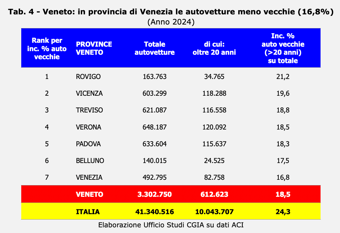 Non solo: tra i grandi Paesi dell’Unione Europea, l’Italia ha il parco auto più anziano. Quasi un’auto su quattro – il 24,3 per cento – ha più di vent’anni. Fa peggio soltanto la Spagna (25,6 per cento), mentre la Francia si ferma a poco più di una su otto (12,5 per cento) e la Germania addirittura a una su dieci (10 per cento). In Veneto, invece, il dato medio si attesta al 18,5 per cento, con punte del 21,2 a Rovigo e del 19,6 a Vicenza (vedi Tab. 4).