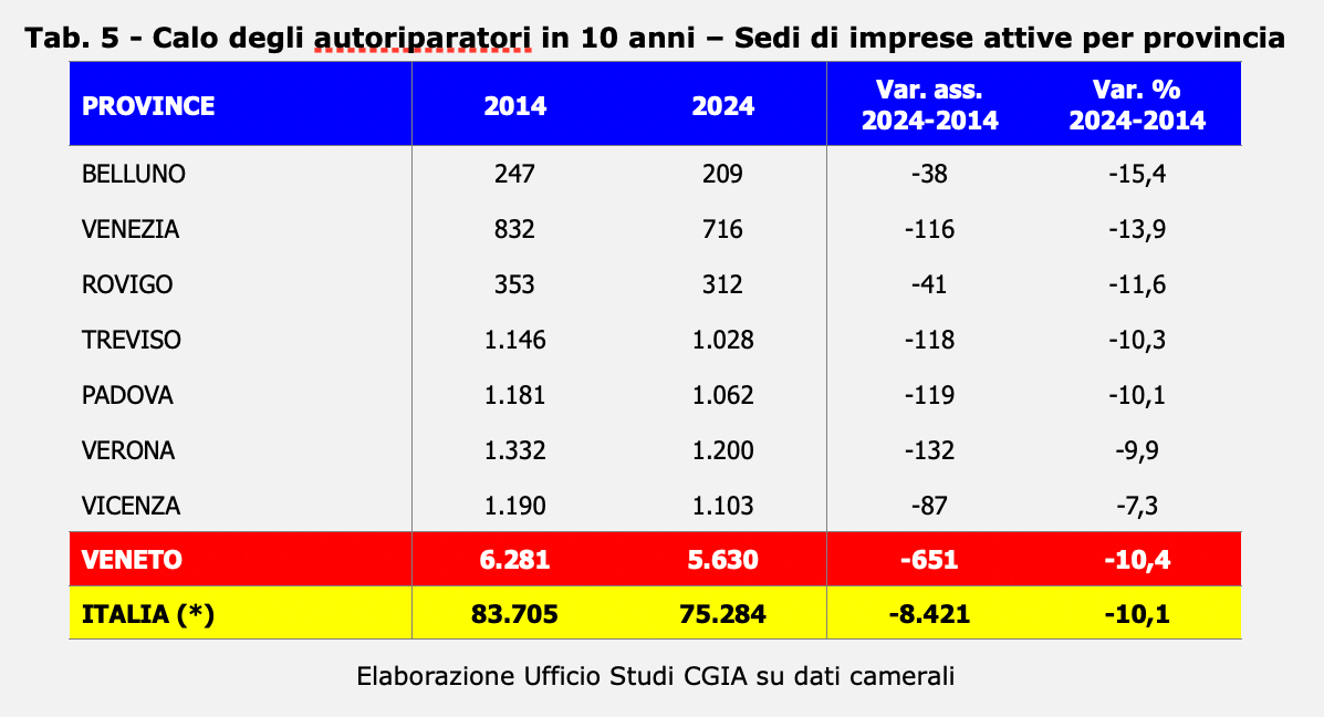 Con tante vetture, e per di più datate e bisognose di manutenzione, ci si aspetterebbe un aumento delle attività di autoriparazione (carrozzieri, autofficine, gommisti, elettrauto, etc.). Accade invece il contrario. Gli autoriparatori, in particolare quelli indipendenti, continuano a diminuire: nel 2024 le attività in Veneto erano 5.630; dieci anni prima 6.281. In pratica ne sono “scomparse” 651, con un calo del 10,4 per cento. A livello provinciale la contrazione più significativa ha interessato Belluno con il -15,4 per cento (in valore assoluto -38), Venezia con il -13,9 (-116), Rovigo con -11,6 (-41) e Treviso con -10,3 (-118) (vedi Tab. 5). Questo approfondimento è stato realizzato dall’Ufficio studi della CGIA.